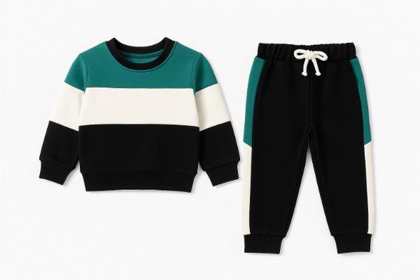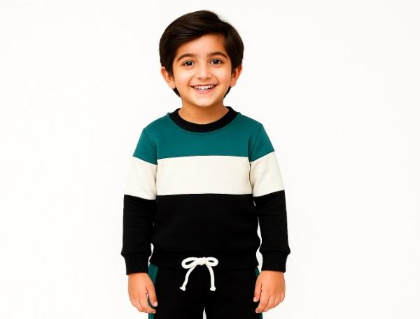 The fleece tracksuit has a color-blocked design in teal, white, and black. The sweatshirt has a round neck and long sleeves, while the sweatpants have a drawstring waist and ribbed cuffs. The tracksuit is made from a soft, warm fleece fabric, suitable for cold weather. The tracksuit is versatile and can be used for sports, playtime, or casual outings.