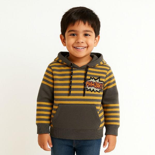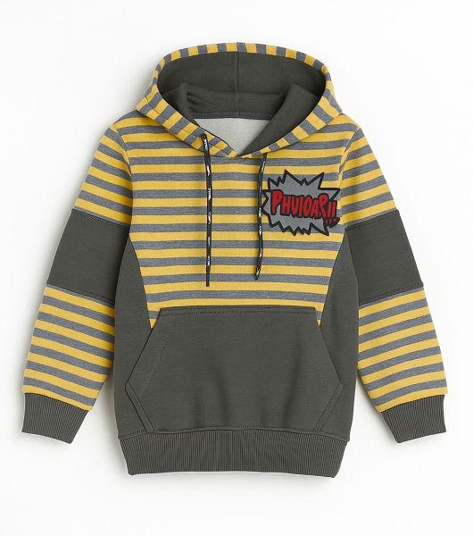 The boys' colorblock striped hoodie has a gray and yellow horizontal striped pattern on the upper half of the body and the sleeves, with solid gray on the lower half of the body . The hoodie is made from a soft material like fleece, which is a blend of cotton and polyester, for comfort.