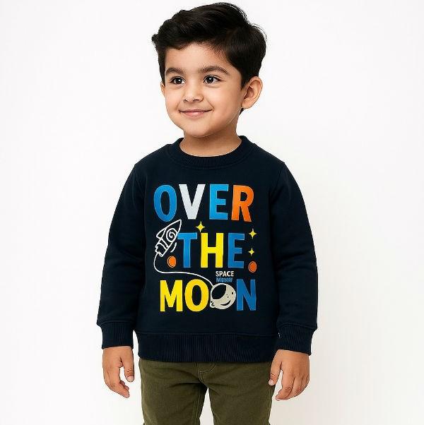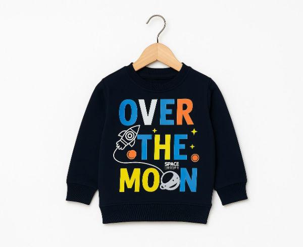 The sweatshirt is a navy blue, long-sleeved, crewneck top with a printed design. The graphic features the text "OVER THE MOON" along with a rocket ship and planets. The material is a cotton blend, with some versions being 100% cotton and others being a mix of cotton and polyester.