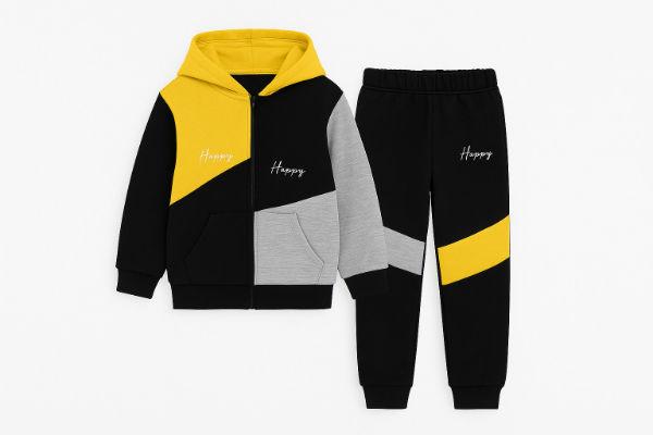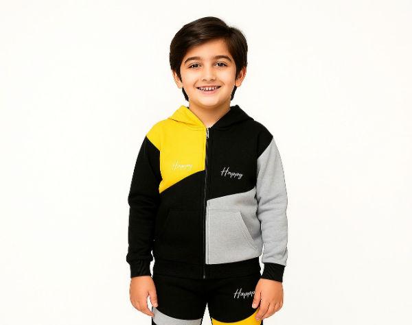 The boy's fleece tracksuit is a color-block design with the word "Happy" embroidered on both the hoodie and the trousers. The fleece tracksuit fabric is a blend of 95% polyester and 5% elastane. It is described as a two-piece set suitable for autumn and winter.