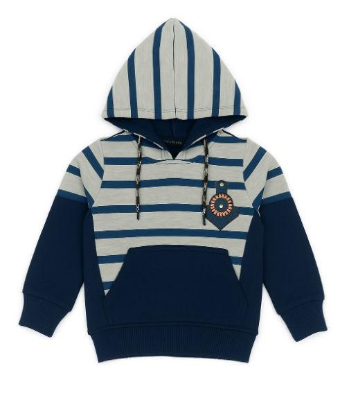It is a striped and navy blue pullover hoodie with a nautical theme. The design features grey and navy blue stripes on the upper half and sleeves, as well as a solid navy blue color on the lower half and the kangaroo pocket. An anchor patch is stitched on the chest. The hoodie is made of 100% cotton