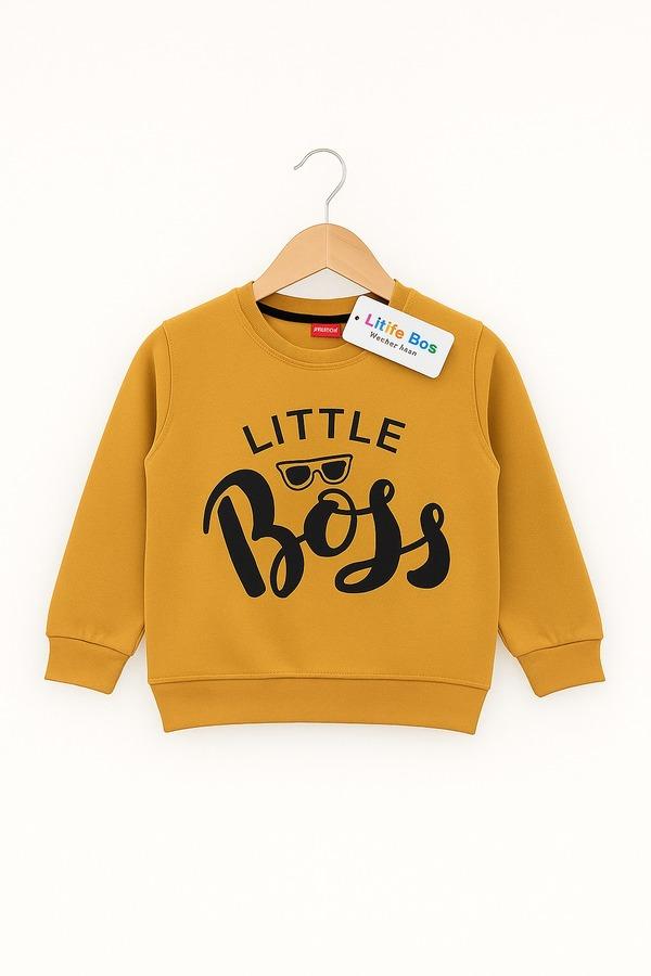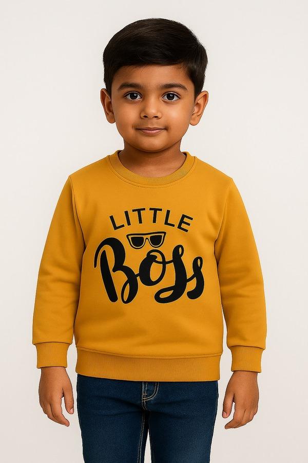 The mustard yellow printed sweatshirt has full sleeves and is likely made of soft cotton, making it comfortable for kids to wear. The design is suitable for both casual wear and playtime