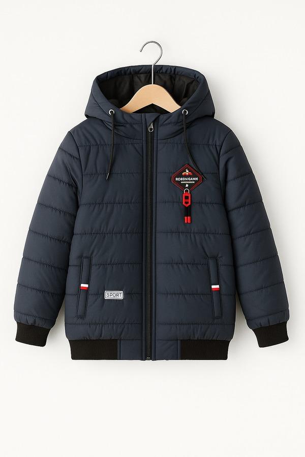 The navy blue boys' puffer jacket hoodie is an outerwear designed to provide warmth in cold weather. It is characterized by its quilted or padded design, which is filled with insulation, such as down or synthetic fibers, to trap heat. The outer fabric is often water-resistant, making it practical for various weather conditions.