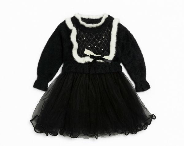 The rabbit wool frock is a black long-sleeved dress with a fuzzy, rabbit wool-like texture on the bodice and sleeves. It features a white trim around the collar and cuffs, and a pattern of small pearls on the front of the bodice. The skirt is a layered, fluffy black tulle.