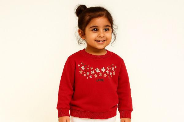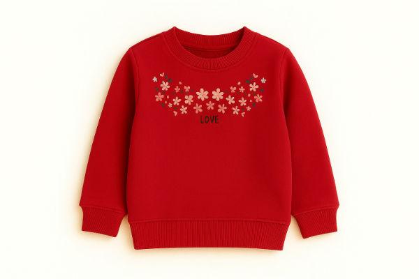 The embroidered fleece sweatshirt is a red long-sleeve crewneck top. It is a pullover style with ribbed cuffs and a ribbed hem. The front of the sweatshirt features chain-stitched embroidery, including floral patterns and the word LOVE. It is often made from a cotton and polyester fleece blend.