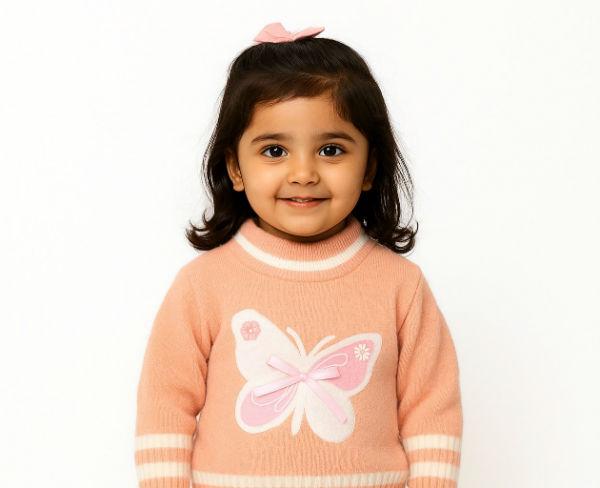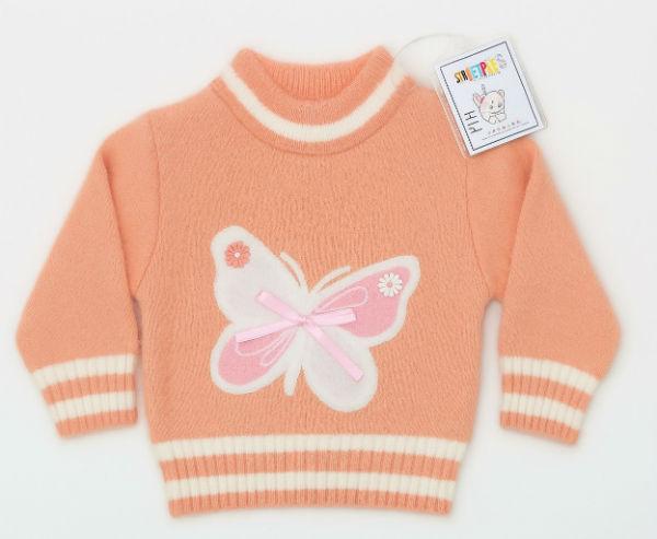 The rabbit wool sweater is light pink with a white butterfly design on the front. It is made of a blended fabric, possibly a jacquard knit, and has white stripes on the collar, cuffs, and hem. The brand appears to be "Karrot". The high-quality sweater combines comfort, durability, and modern design — ideal for cool weather and everyday wear.