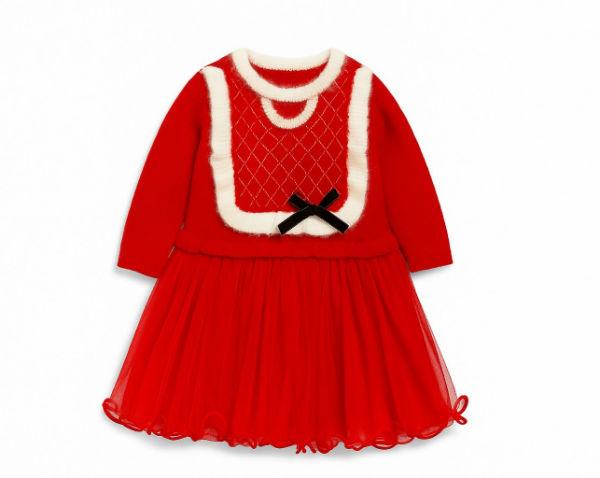 Adorable red frock is a soft knitted bodice with a white quilted chest panel adorned with pearls. Elegant black bow accent adds charm to the design. Long sleeves ensure warmth and comfort for cooler days. Flowy red tulle skirt creates a perfect festive and party-ready look.