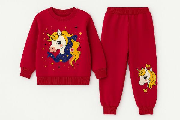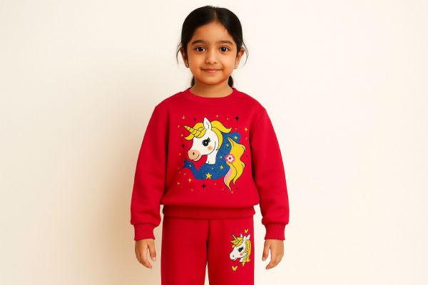 The cotton fleece tracksuit showcases a bold unicorn graphic on the front of the sweatshirt and a smaller matching unicorn design on the left leg of the joggers. Made from premium soft fleece, this cozy set delivers exceptional warmth and comfort—perfect for stylish, casual wear in cooler weather.