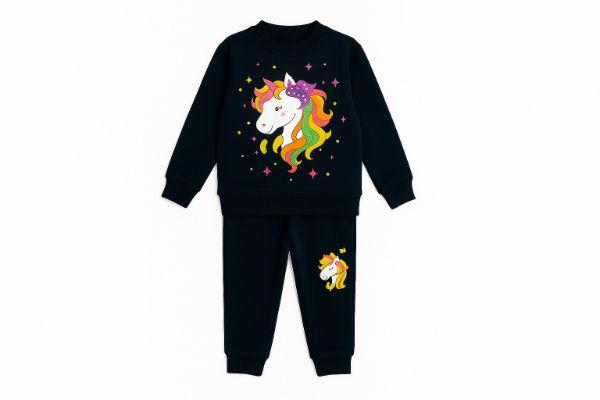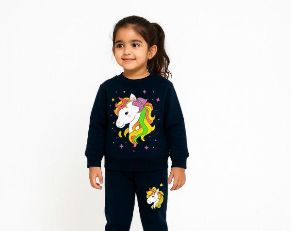 The fleece tracksuit with a vibrant unicorn graphic on the sweatshirt and a smaller one on the pants. The tracksuit is made from cotton fleece, specifically described as "Super Combed Cotton Fleece" or 100% cotton. It is a full-sleeve T-shirt and suitable for lounging or as a pyjama set. The material is noted to be machine washable and durable.