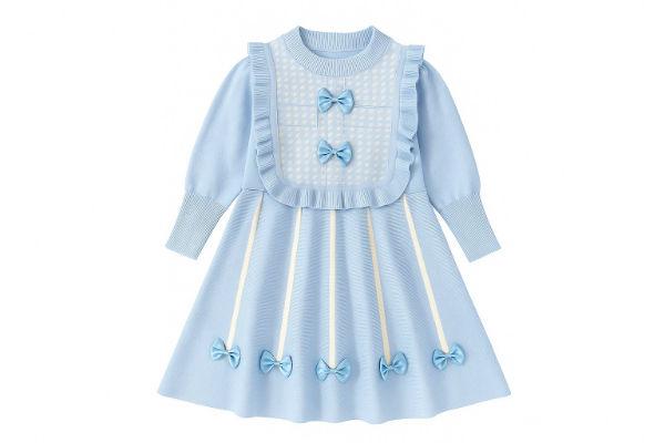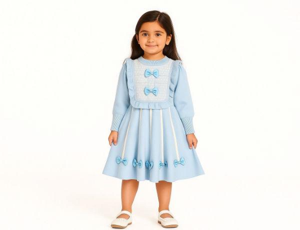 Cozy light blue woolen knitted frock with a high neckline and long sleeves. Adorned with cute light blue bows on the chest and along the pleated skirt for a charming look. Made from a thick wool-cashmere blend, this knitted frock is perfect for autumn and winter wear, ideal for casual days or special occasions.