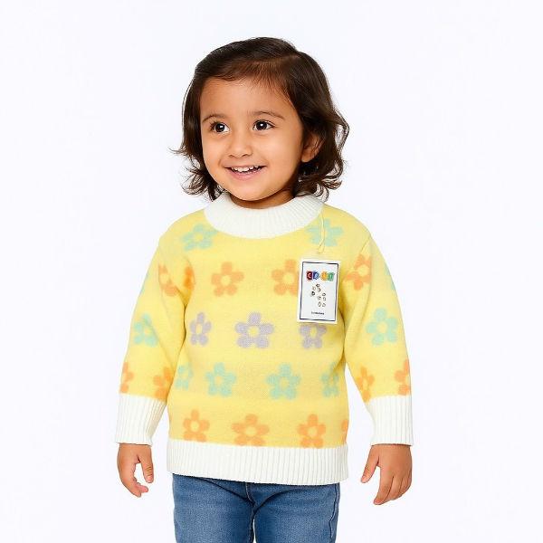 The yellow rabbit-wool pullover features a cozy crew neck, long sleeves, and a soft knitted floral design. Its warm and gentle feel provides comfort in cooler weather. With multiple sizes and a unisex style, it’s perfect for both boys and girls for casual or semi-formal wear.